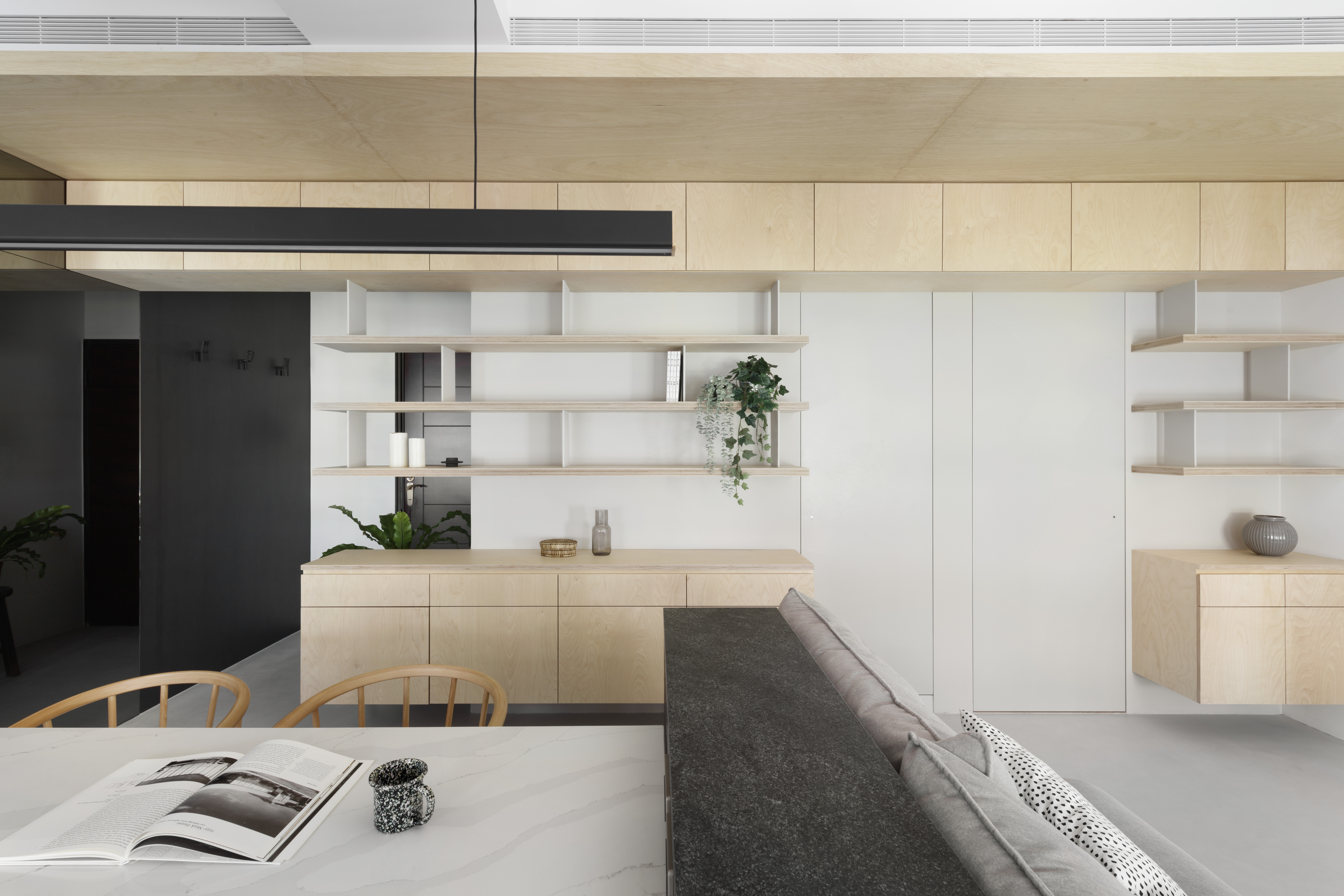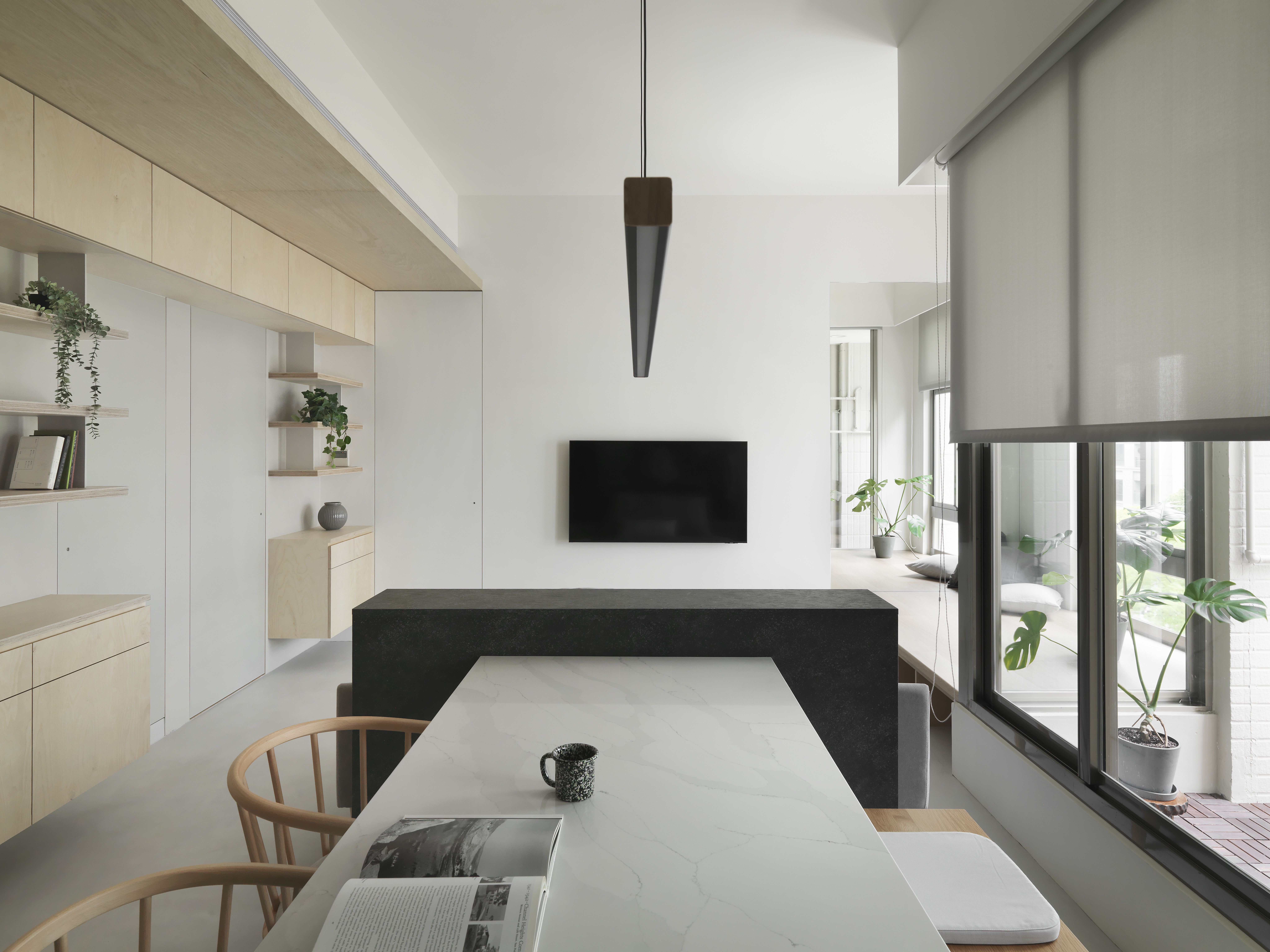 此空間配置設計除了擴大各空間的使用範圍創造了極具互動的中央共同空間,並保有周邊空間的獨立穩定性。配合此概念在家具設計上以活動式的組合方桌創造不同情境的公共空間,由四周延展至中央或中央蔓延至邊緣,保有生活樣貌的靈活性。